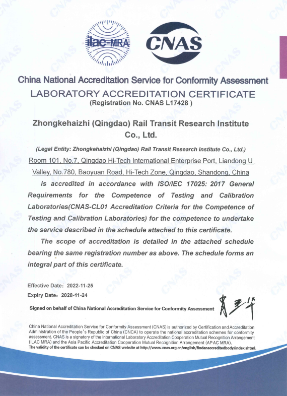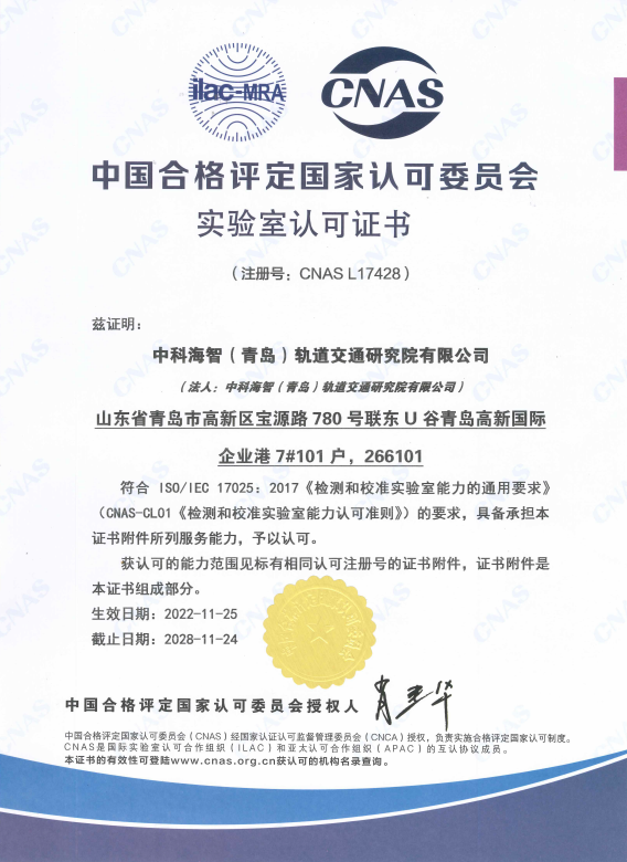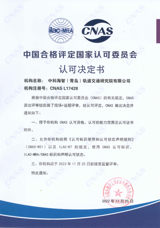 在公司领导及员工的不懈努力下,经过评审专家全面、严格的指导和审核,最终在2022年11月25日,确认中科海智(青岛)轨道交通研究院有限公司符合 ISO/IEC 17025:2017《检测和校准实验室能力的通用要求》(CNAS—CL01《检测和校准实验室能力认可准则》)的要求,具备承担CNAS证书附件所列服务能力。并于同日向我公司正式颁发了CNAS 认可证书、CNAS认可决定书。