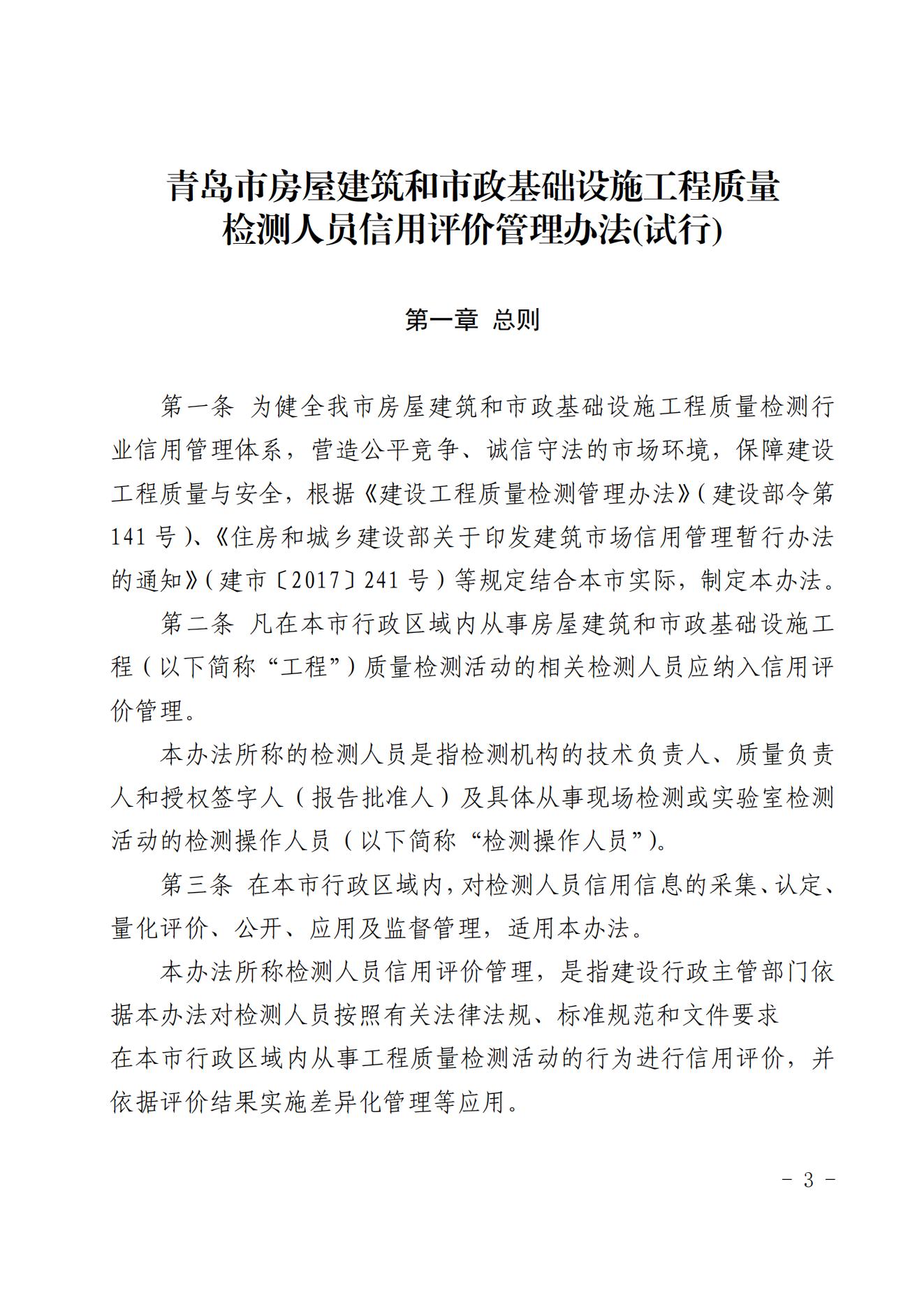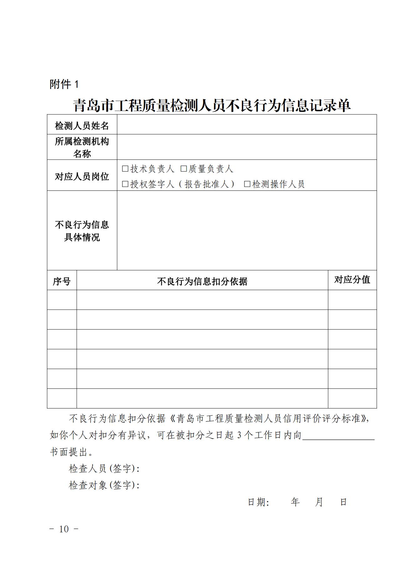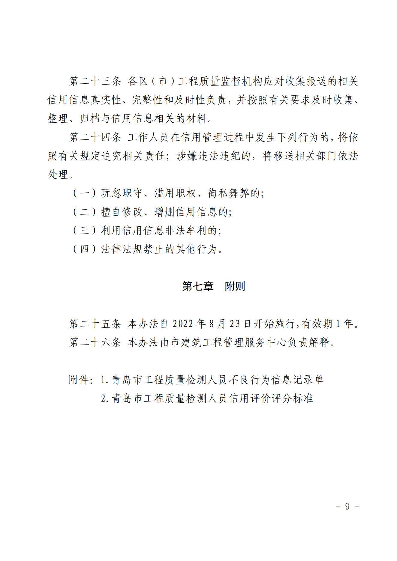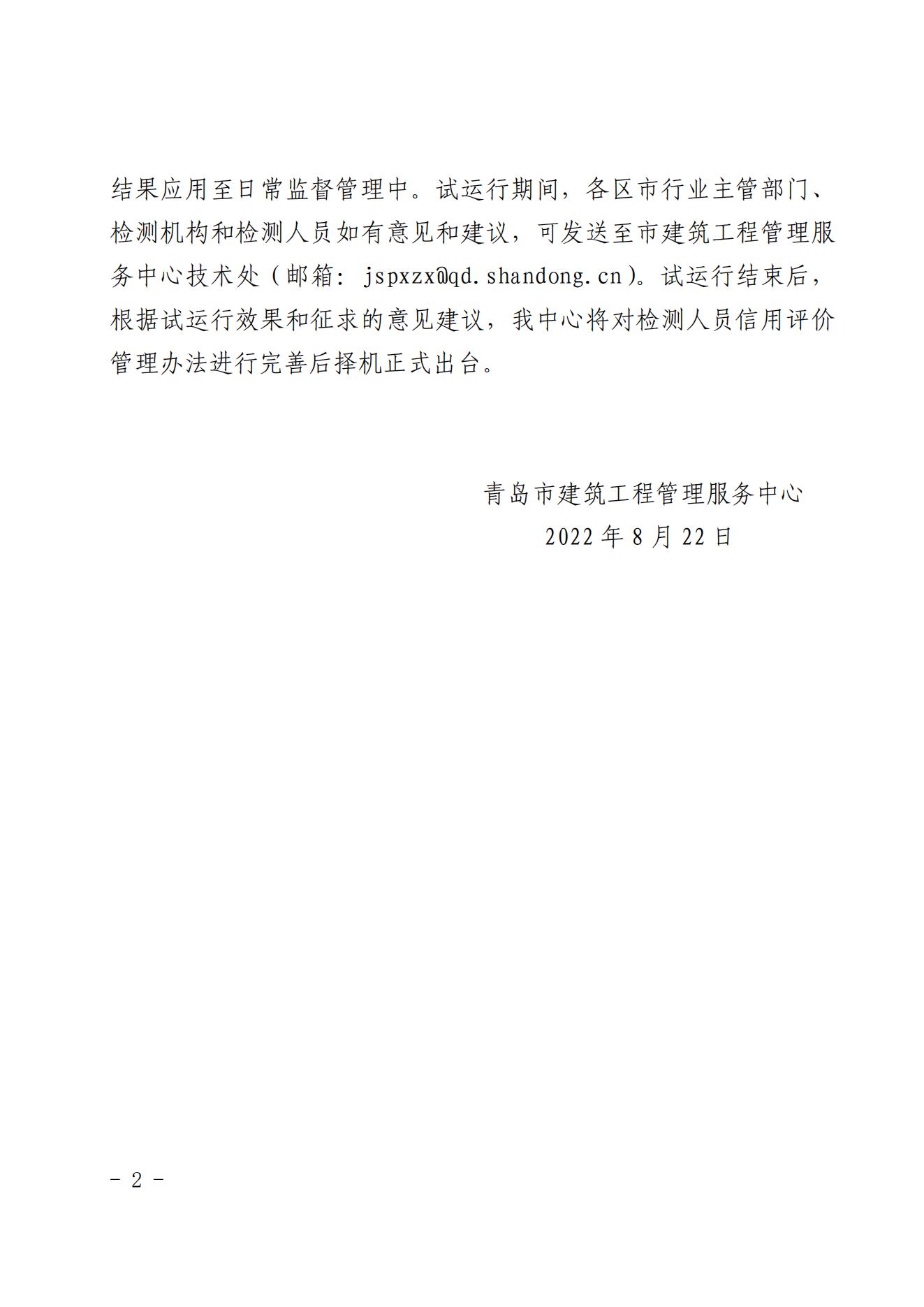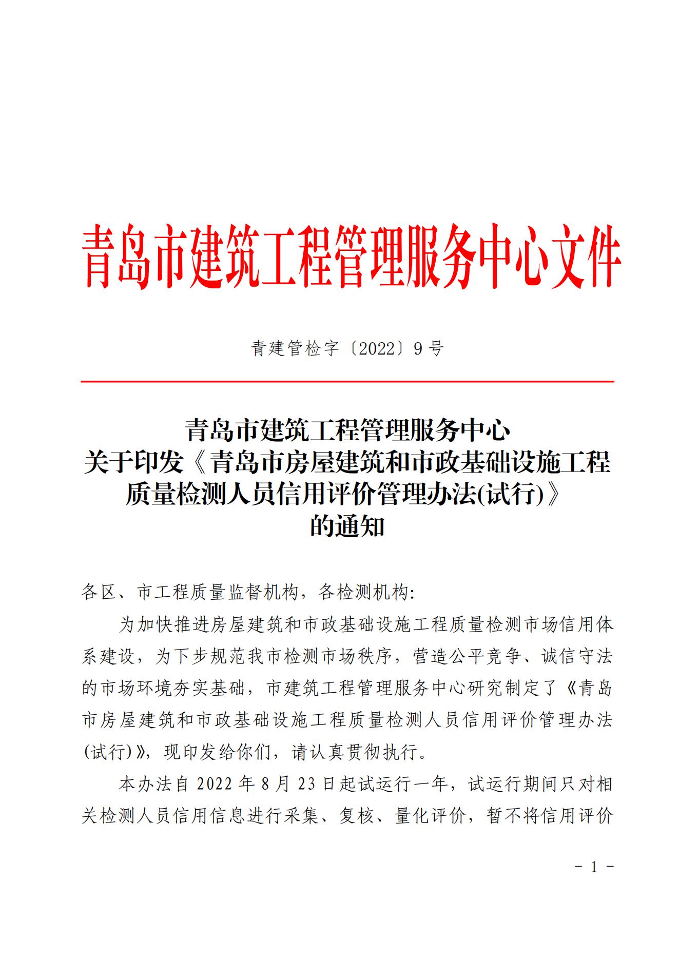青建管检字〔2022〕9号-关于印发《青岛市房屋建筑和市政基础设施工程质量检测人员信用评价管理办法(试行)》